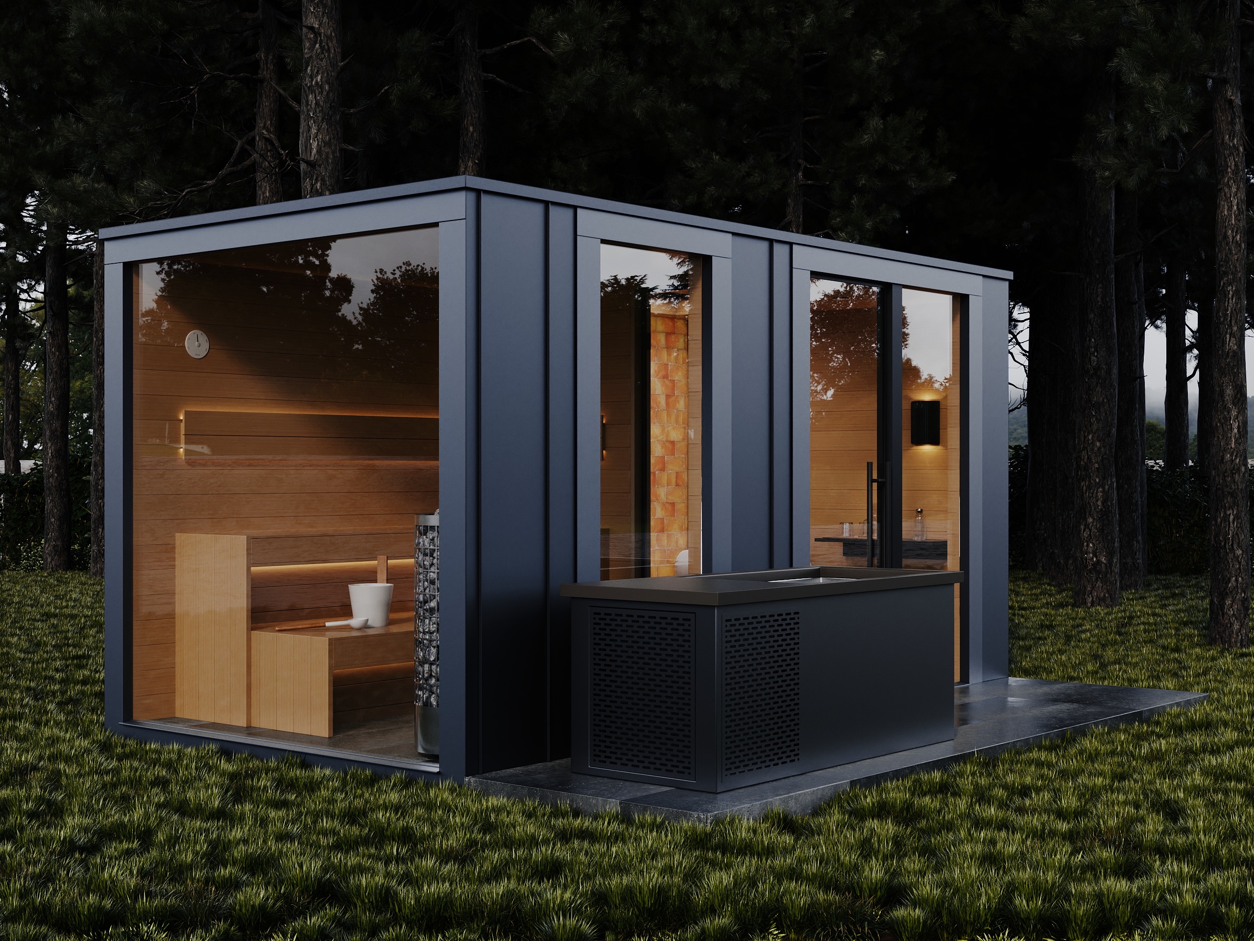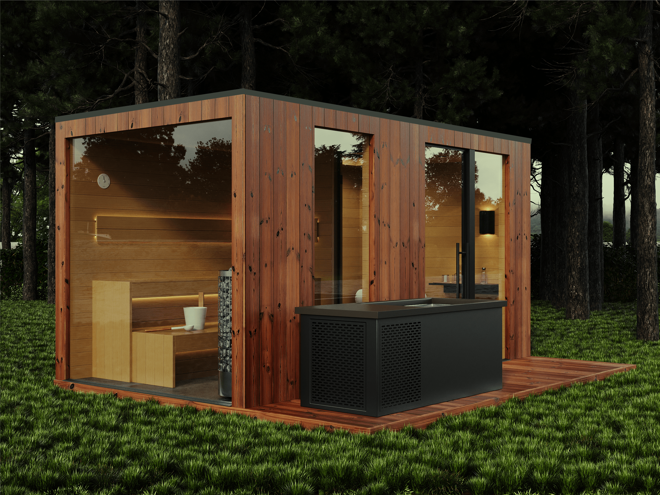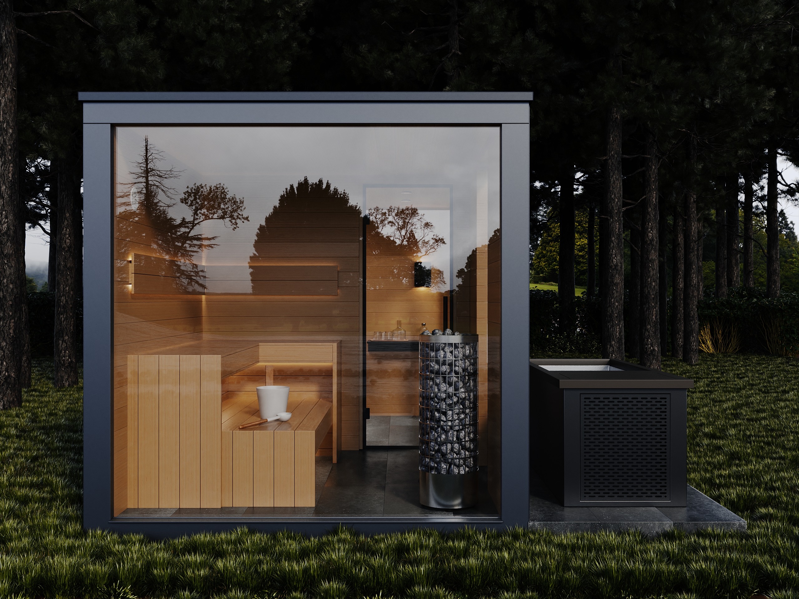 Front części saunowej z ogromnej tafli szkła daje efekt otwartej przestrzeni i mocno odróżnia Cube+ od klasycznych saun ogrodowych.